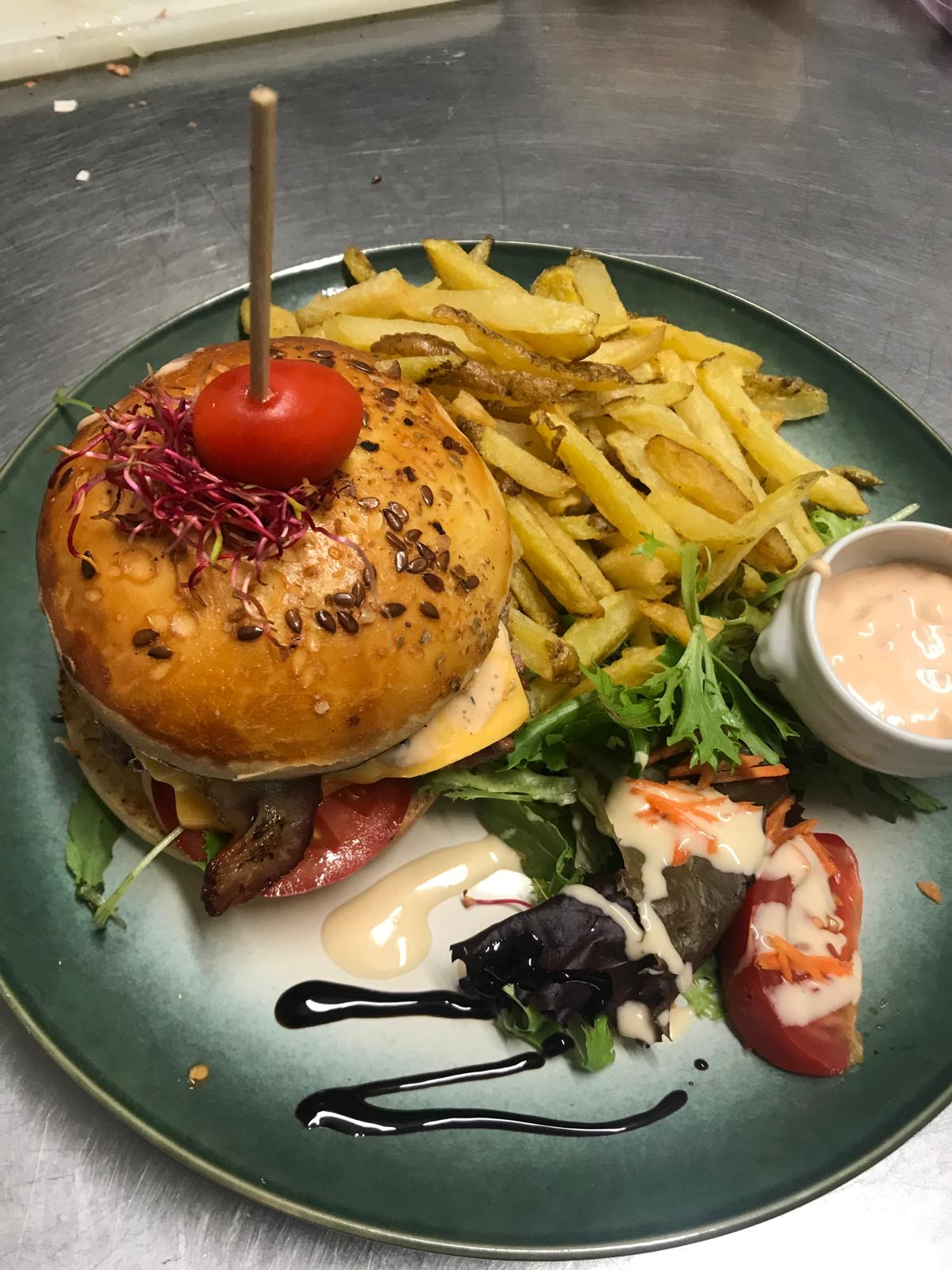 Steak / Cheddar / Salade / Tomate / Oignon confit / Bacon / Sauce burger